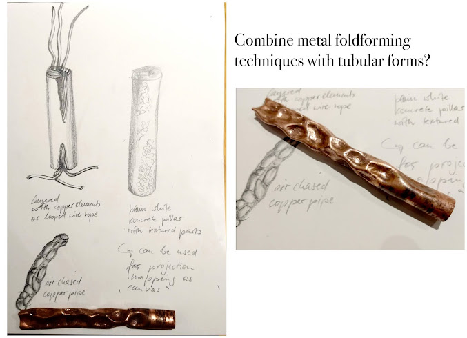 I'm also looking into a relatively new technique of metal smithing called fold forming. The man who initiated/invented this work form is called Charles Lewton-Brain. In his book he explains step by step how to approach the different folds and shares his wealth of knowledge and experience.Starting point is always a piece of sheet metal, mostly copper, that is folded, then heated up to glowing temperature (annealed) in order to make the metal workable again. Then the fold can easily be opened and defined before adding another fold to repeat the principle. The ways these folds are being defined are very versatile. Depending on the shape (peen) of the hammer and which side of the folded piece is being worked, there are endless possibilities to create three-dimensional forms.